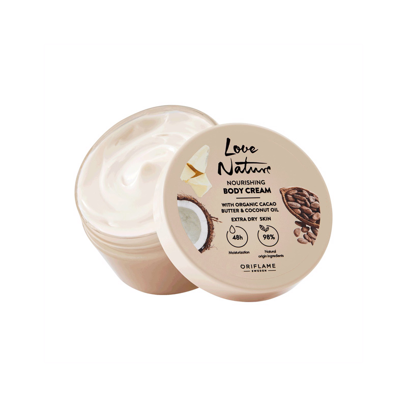 کرم بدن مغذی حاوی کره کاکائو و روغن نارگیل ارگانیک  سری لاو نیچر دارای بافت غنی و کرمی است که با 98 درصد ترکیبات طبیعی و ارگانیک تهیه شده است. این محصول حاوی روغن نارگیل ارگانیک، شی باتر و کره کاکائو طبیعی و سرشار از اسیدهای چرب می باشد. از این رو به خوبی جذب پوست شده و آن را عمیقا تغذیه و مرطوب می کند. همچنین از نظر بالینی ثابت شده است که آبرسانی 48 ساعته را حتی برای خشک ترین پوست ها فراهم می سازد. در نتیجه باعث نرم و صاف شدن پوست می شود. این محصول از نظر متخصص پوست تست شده و برای انواع پوست خصوصا پوست های بسیار خشک مناسب می باشد. این کرم بدن مغذی دارای رایحه ای لذیذ است.